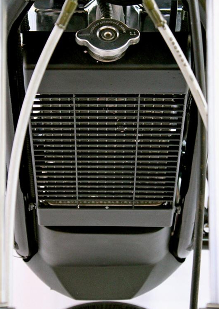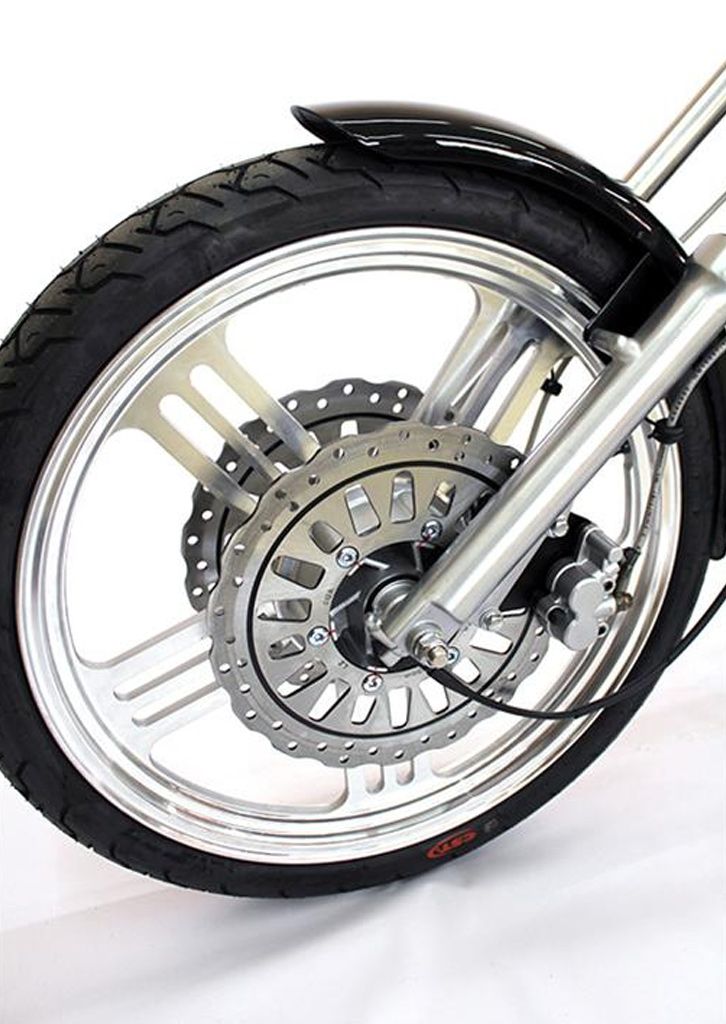 Cuidada hasta el último detalle… la inmensa llanta delantera de 21”, las estriberas cromadas o el manillar gordo y plano *que esconde los cables eléctricos*,ofrece al conjunto rigidez y limpieza.