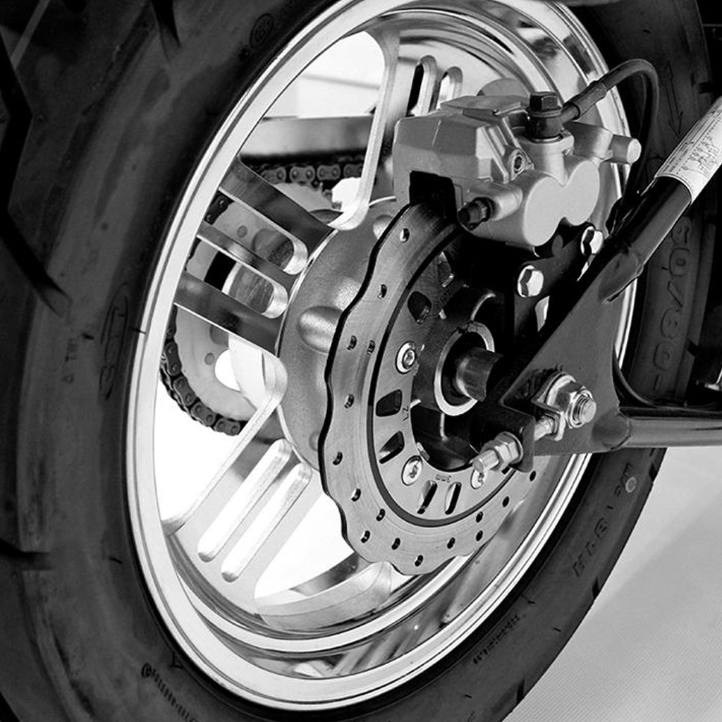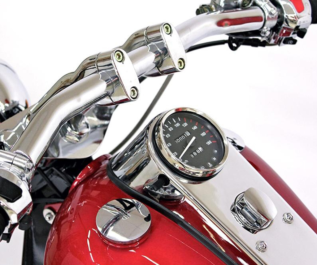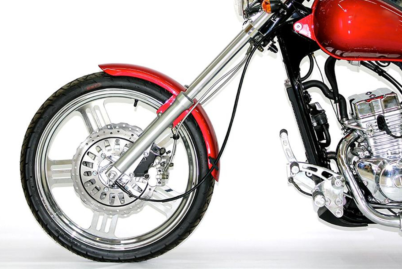 Cuenta kilómetros sobre el depósito, cromados y la horquilla delantera lanzada al más puro estilo Chopper, con una rueda trasera gorda de 160mm.